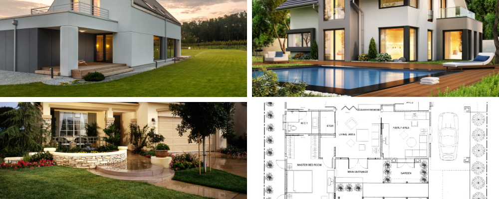 Water Features & Outdoor Amenities – Swimming pools, fountains, ponds, seating areas, and outdoor kitchens.